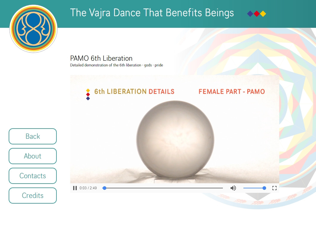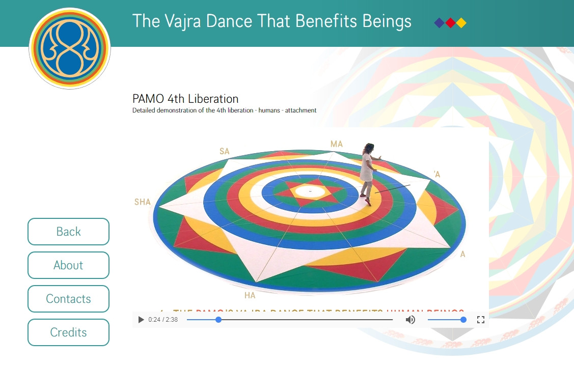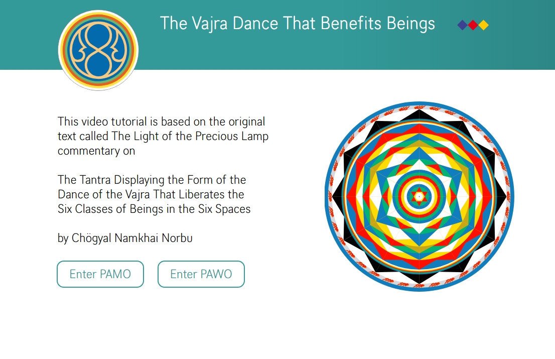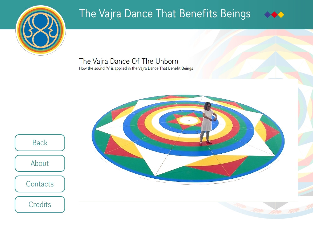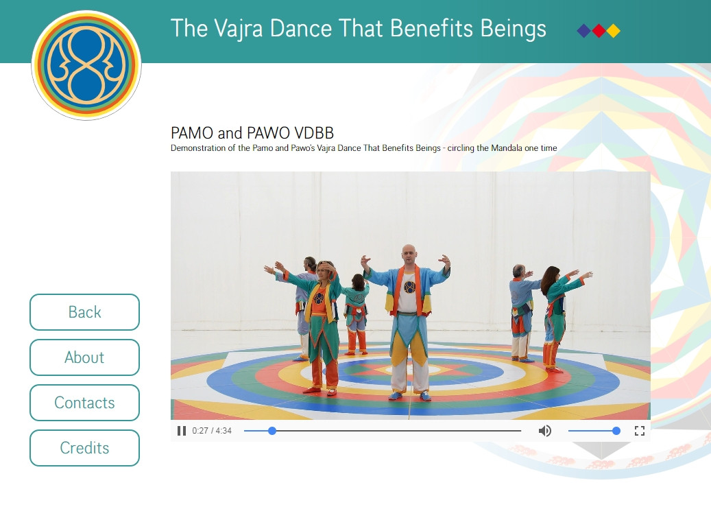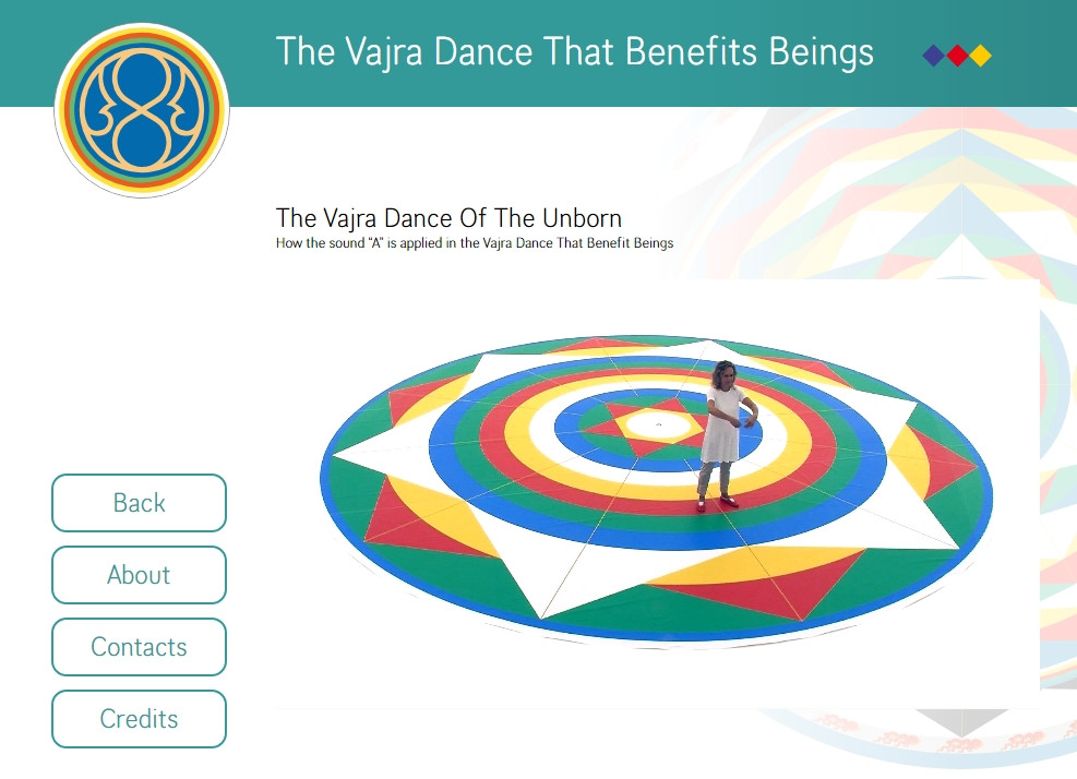 The Vajra Dance That Benefits Beings is a symbolic dance of the interrelationship of all sentient beings. Up to twelve dancers (six females and six males) dance and sing together on a large Mandala of five colors representing the correspondence between the internal dimension of the individual and the outer dimension of the world. The intoned syllables are closely related to the purification and harmonization of our main chakras.