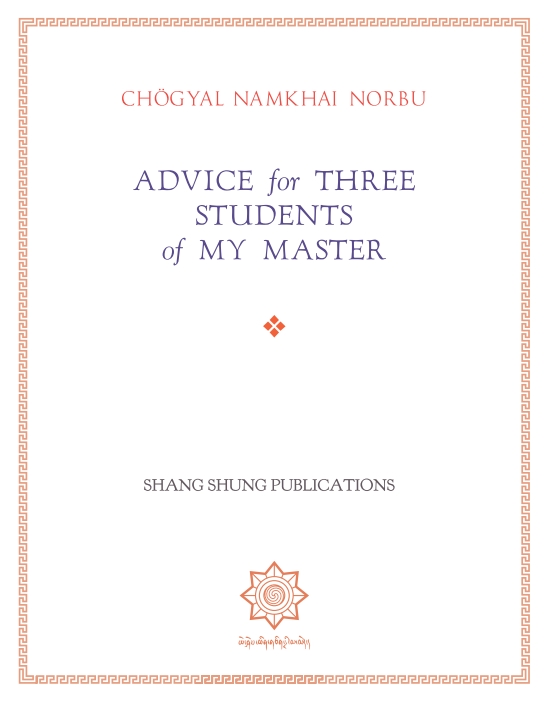 The day of his departure, Chögyal Namkhai Norbu was asked by several old students of Changchub Dorje for advice about practice, and he then offered these three spontaneous songs containing the essence of Dzogchen in its three aspects of view, meditation, and conduct. The first song, Advice to the Hermit Lama Namgyal, expresses the essence of the Dzogchen path in just a few, succinct lines. It is dedicated to Lama Namgyal, a Nyingmapa monk who had lived for many years at Khamdo Gar. The second song, Advice to Lama Tsega, is dedicated to a practitioner who was originally a monk from the Drugpa lineage, here called by the Sanskrit equivalent of his name, Ayu. In this song, the principle of instant presence as the main point of meditation is presented with brilliant clarity. The last song, Advice to Lama Pema Loden, is a short, beautiful poem offered to Pema Loden, a relative of Changchub Dorje and at that time administrator of Khamdo Gar.