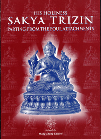 Sua Santita' Sakya Trizin ha trasmesso questi insegnamenti a Merigar nel giugno 1998. Nel corso del ritiro S.S. ha spiegato: "In questi giorni daro' degli insegnamenti su come Abbandonare i Quattro Attaccamenti. Questi insegnamenti risalgono al grande Lama Sakyapa Kunga Nyingpo. Dopo aver completato un ritiro di sei mesi incentrato sulla pratica di Manjushri, un giorno Lama Sakyapa nella sua visione pura vide Manjushri in persona seduto su un trono di gioielli, con le mani atteggiate nella mudra dell'insegnamento, affiancato da due Bodhisattva che gli facevano da assistenti, uno da ciascun lato. Allora Manjushri, che era la divinita' principale, gli diede questo insegnamento composto di quattro versi. Tutte le vie del Sutrayana sono comprese in questi quattro versi. Attraverso questa pratica, Lama Sakyapa acquisto' la visione profonda e poi trasmise l'insegnamento ai suoi figli. Da allora questo insegnamento e' stato trasmesso senza interruzione di maestro in maestro fino a oggi."