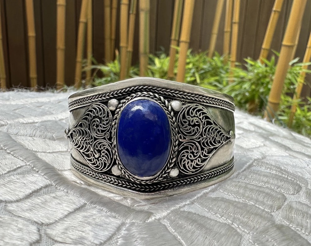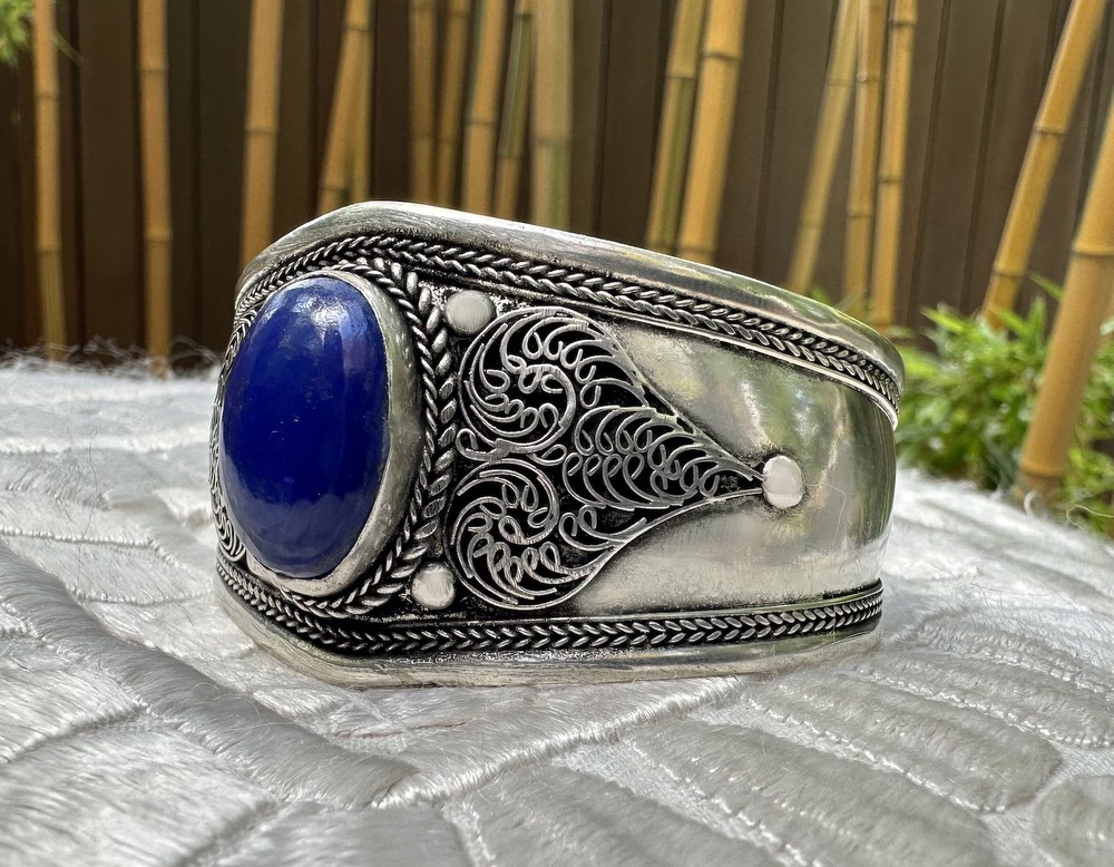 The material is antique silver, that is, a silver alloy made from old coins. The bracelet has a huge beautiful blue lapis lazuli in the middle. It can be adjusted to the right size by bending it.