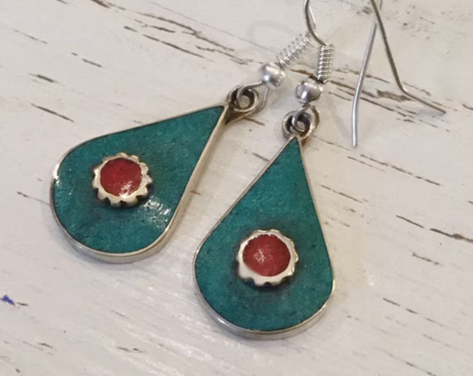 Orecchini in argento 925 corallo e turchese. Provenienza Nepal.